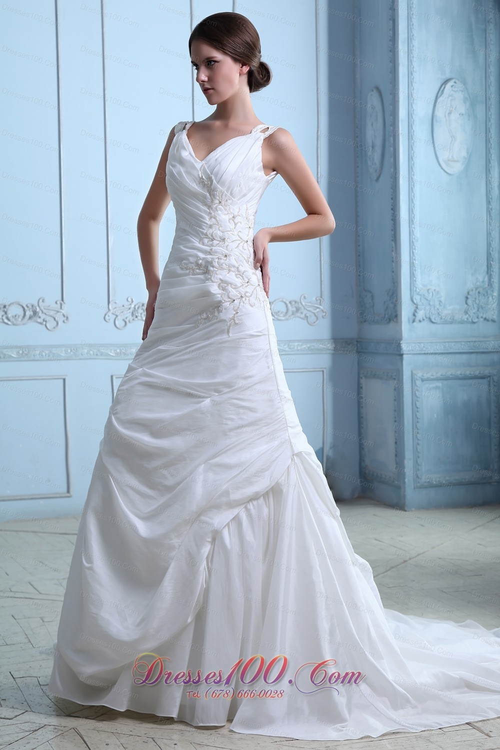 V-neck Ruch Appliques Bridal Dress Taffeta Spring