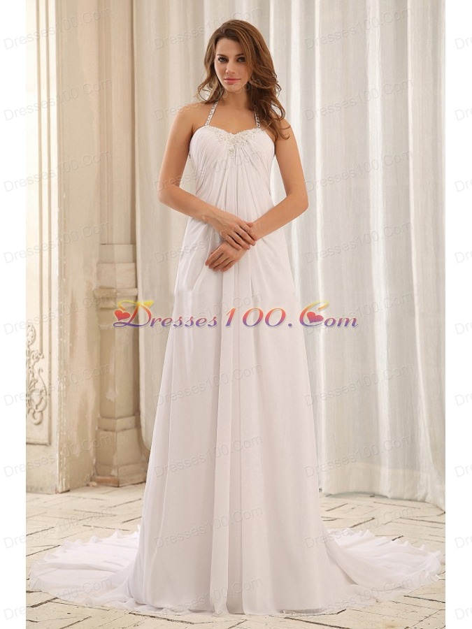 Do you want to experience the feeling of being the spotlight? This wedding dress will make your dream come ture. One-piece and strapless in a-line silhouette with corset closure. This chiffon gown features beaded sweetheart neckline accenting the halter ruched bodice. The train adds the charm.