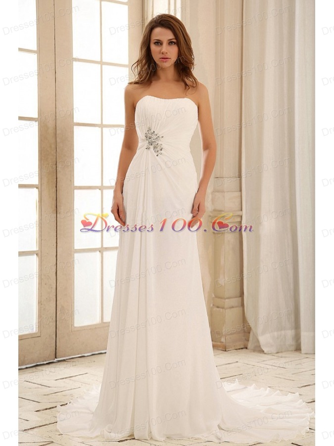 Do you want to be the special and attractive bride? Your dream will come true when you wear this wedding gown. The fitted, strapless bodice made of an all-over ruches. The beadings adorn the waistline. A lace up makes for easy off and on and secures the dress in place. The sweep train completes the chiffon wedding dress.