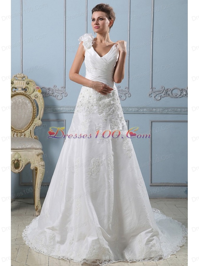 V-neck A-line 2013 Wedding Dress Lace With Ruched Bodice