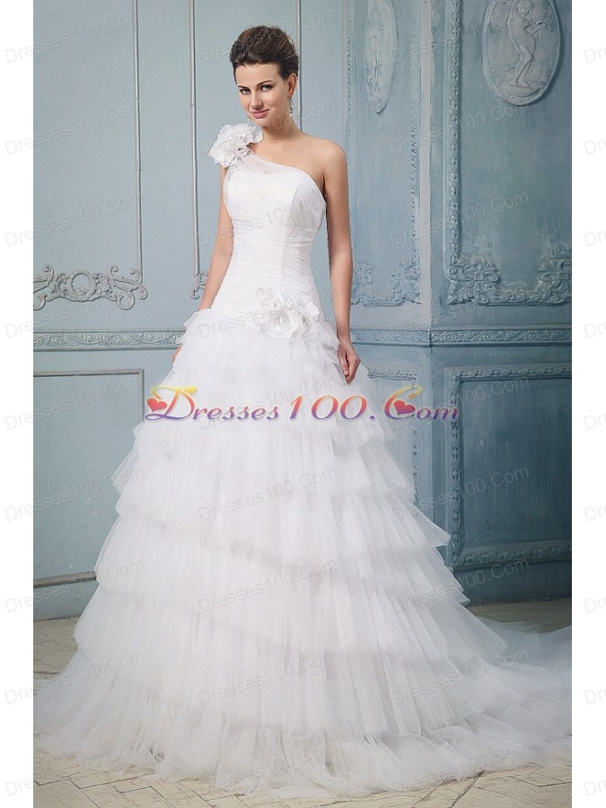 Ruffled Layered One Shoulder Wedding Dress Hand Made Flowers