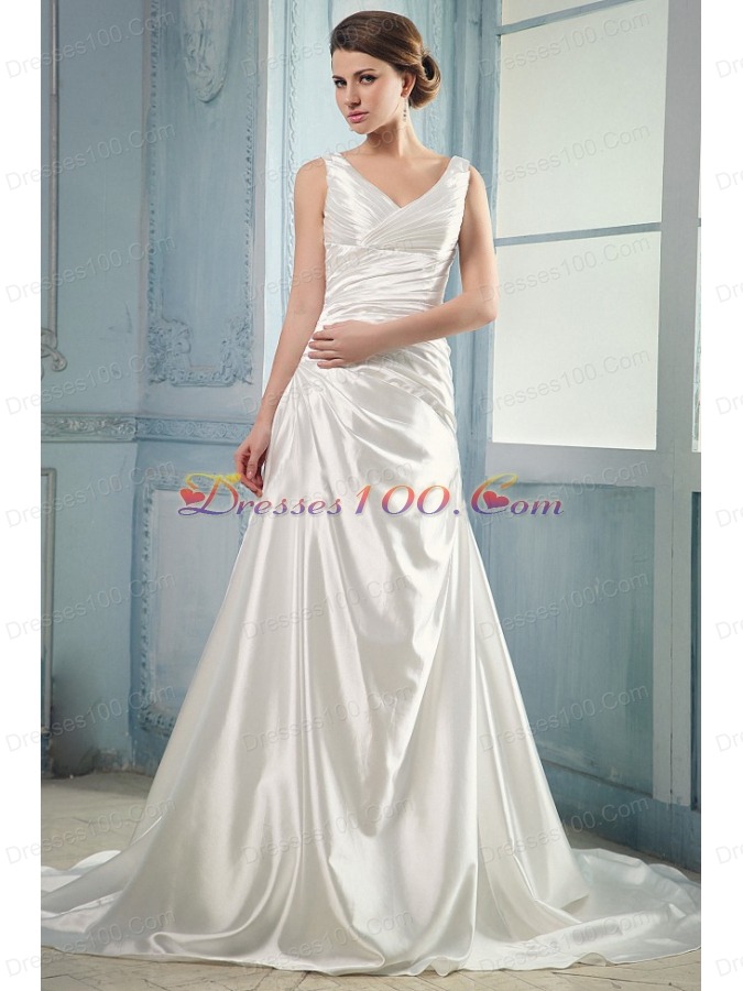 V-neck Ruching Taffeta Wedding Dress With Court Train