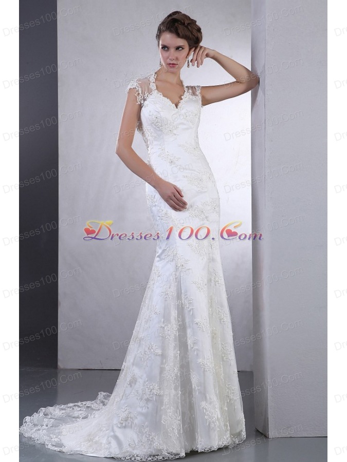 This classic and elegant wedding dress is also modern and stylish. Long lace wedding gown features a V-neckline that is highlighted with the see-through lace shoulder straps and back which is sexy yet elegent. Who can resist the charming of the fablous lace! Fit and charming gown has a fitted bodice that opens to a mermaid skirt with train. You will be the most shining bride of the wedding.