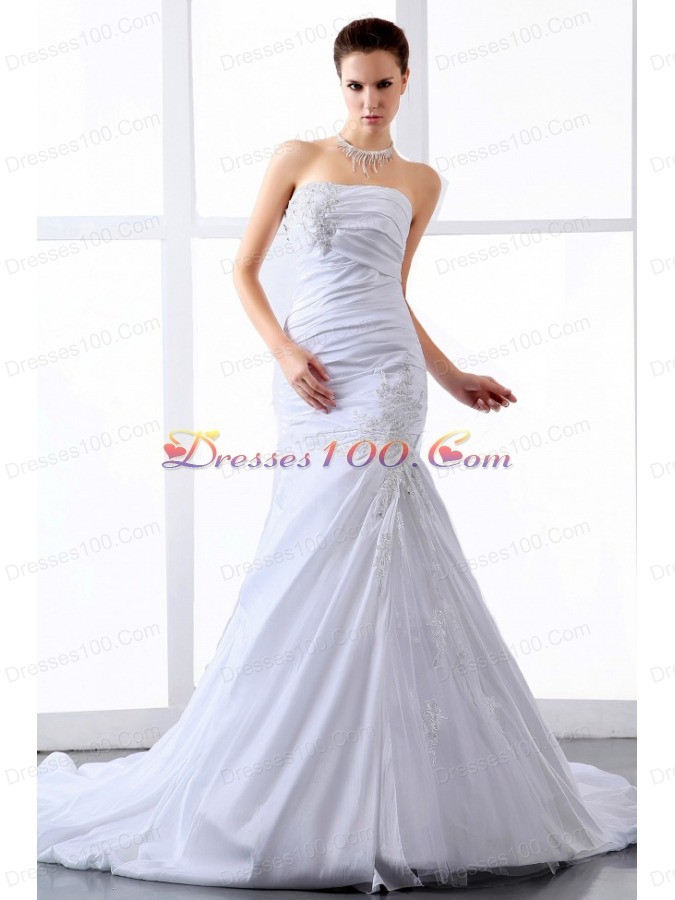 Nothing shows off your curves quite like a mermaid style dress. This is an example of that style. It has a lovely strapless straight neckline, fitted form, exquisite embroidery and beautiful ruching throughout. This style finishes with embroidery found in the bodice. It is elegant and grace for brides.