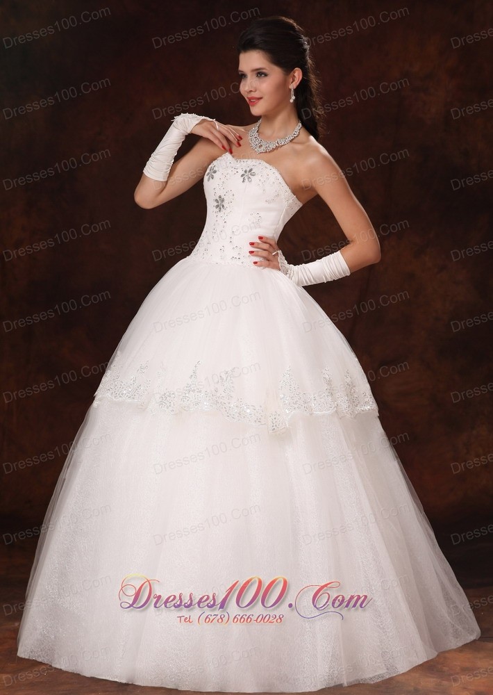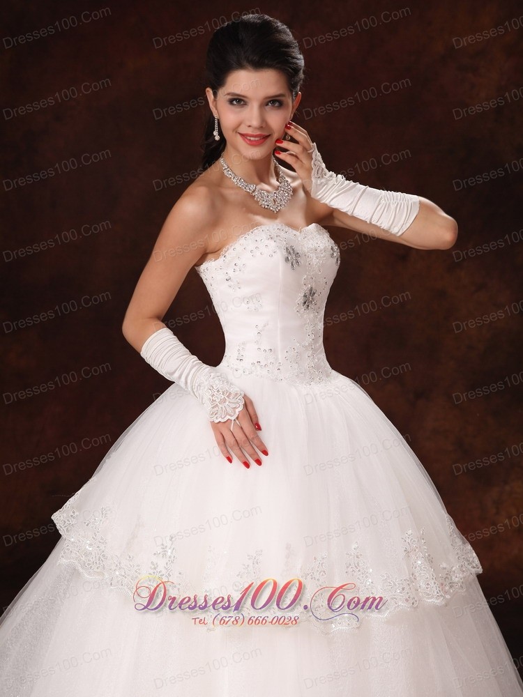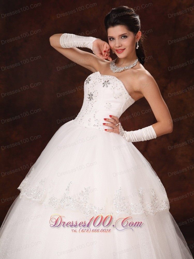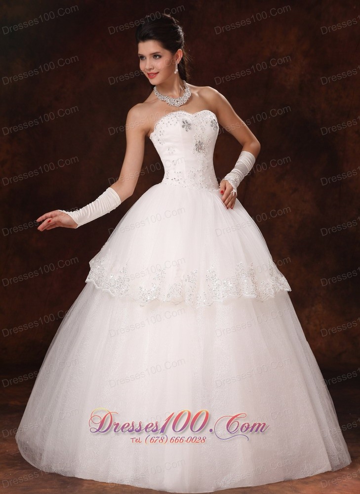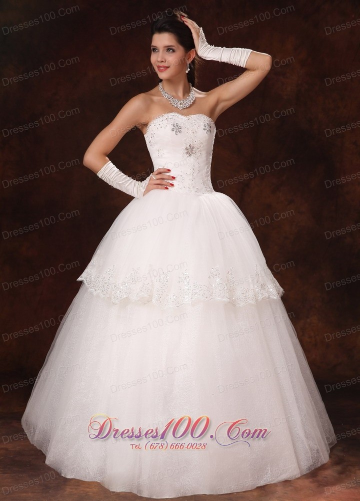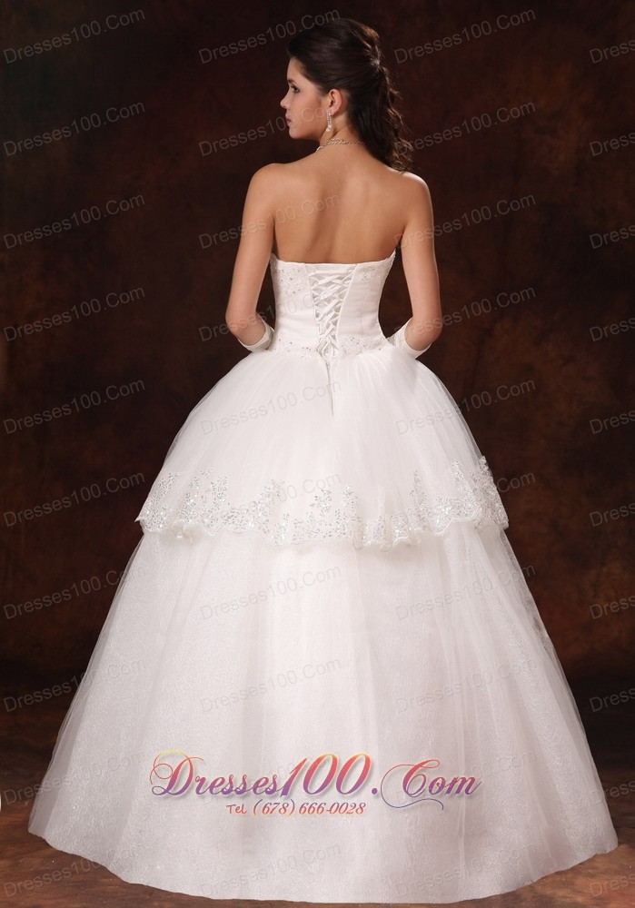Be the belle of the wedding in this fabulous wedding gown! The strapless bodice features a sweetheart neckline and whole bodice is adorned with nice appliques and chic beadings that greatly adds your feminine figure. The tiered floor length skirt is accented with the exquisite appliques embellishments as well as the hem which adds grace to you. A lace-up back completes the look.