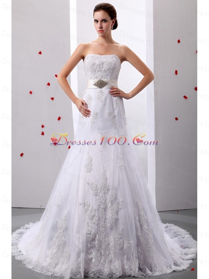 A-Line Strapless Tulle Appliques Beading Wedding Gowns