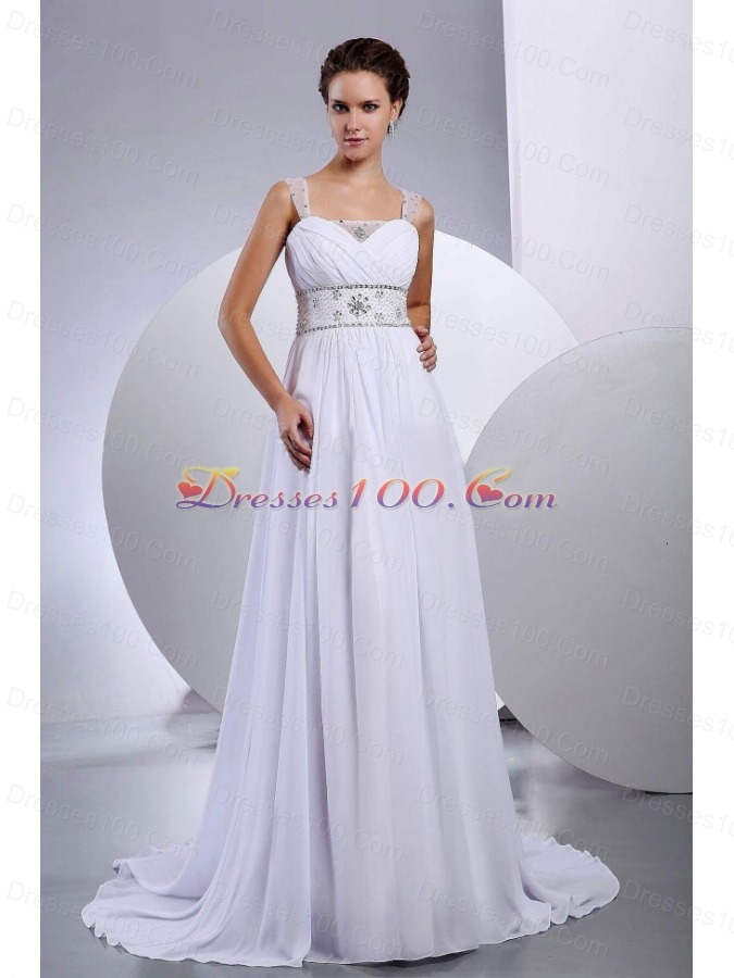 Sweet, romantic dresses never go out of style and are perfect for your wedding. It is characterized by a ruched bodice with beaded straps. The waistband made from shining beads adorns the waist and give the whole dress a glamorous look. The skirt, falling down to the ground naturally, is splendid. It features a zipper up back with elegance. This is best choice for you. What are you waiting?