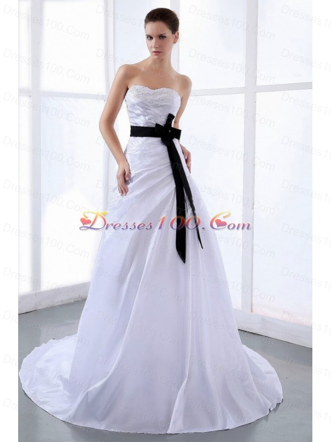 This fabulous wedding gown is gorgeous for celebrating your walk down the aisle. The gorgeous strapless wedding dress features a sweetheart neckline and a black sash with bowknot. A hidden zipper makes for easy off and on and secures the dress in place. The A line skirt with a chapel train completes the wonderful silhouette.
