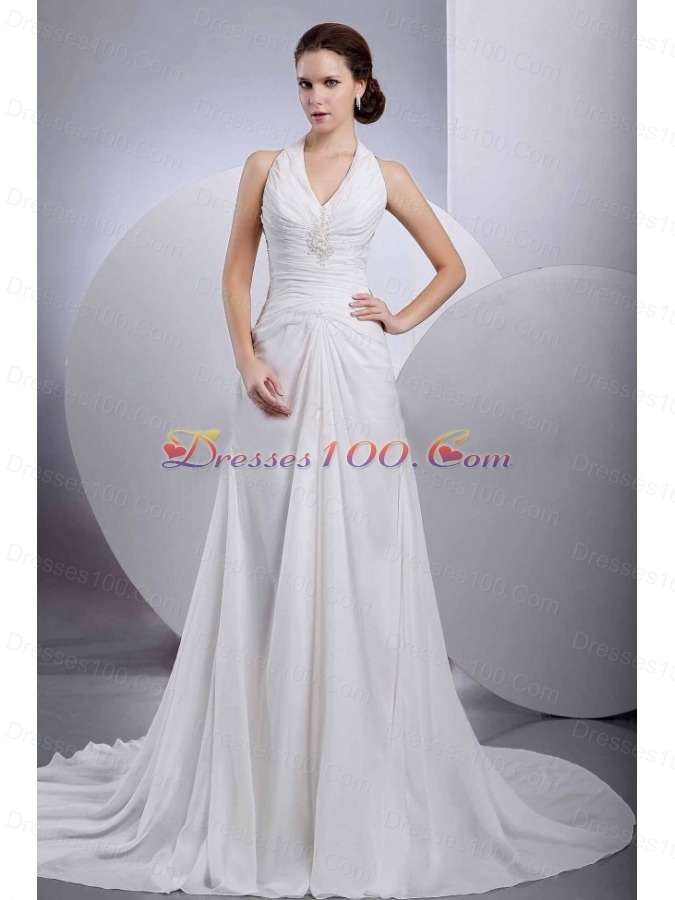 Nothing shows off your curves quite like a bandage-style dress. This is an perfect example. It has a lovely halter-top neckline, fitted bodice with exquisite ruching embellished the whole bodice including the straps. The dress is made of chiffon fabric, so the skirt is soft and flowy and it extends to the back to be a court train which add you the charm of being elegant and graceful. This fashionable design is completed with zipper up back hidden under the buttons in the back.