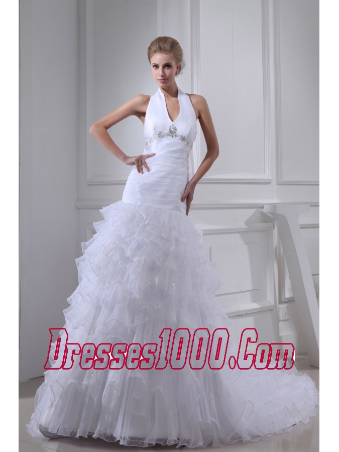 Beading Ruffles A-line Halter Court Train Wedding Dress