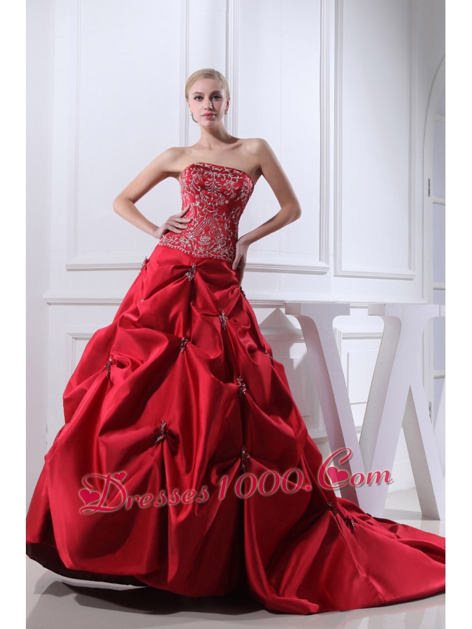 Wine Red Embroidery Pick-ups Chapel Train Ball Gown Wedding Dress