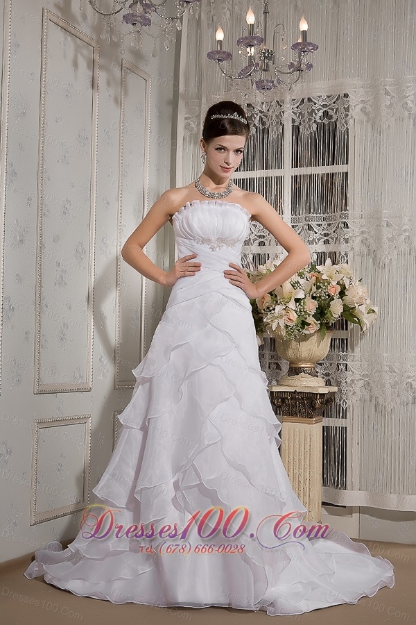 A-line Strapless Court Train Organza Appliques Wedding Gown