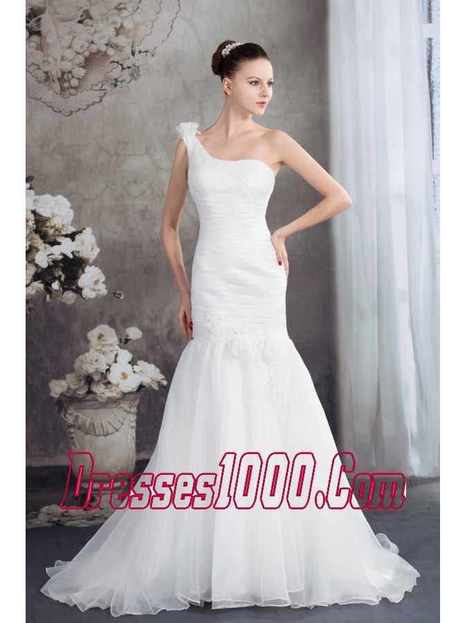 One Shoulder Mermaid Ruching Hand Made Flowers Wedding Dress