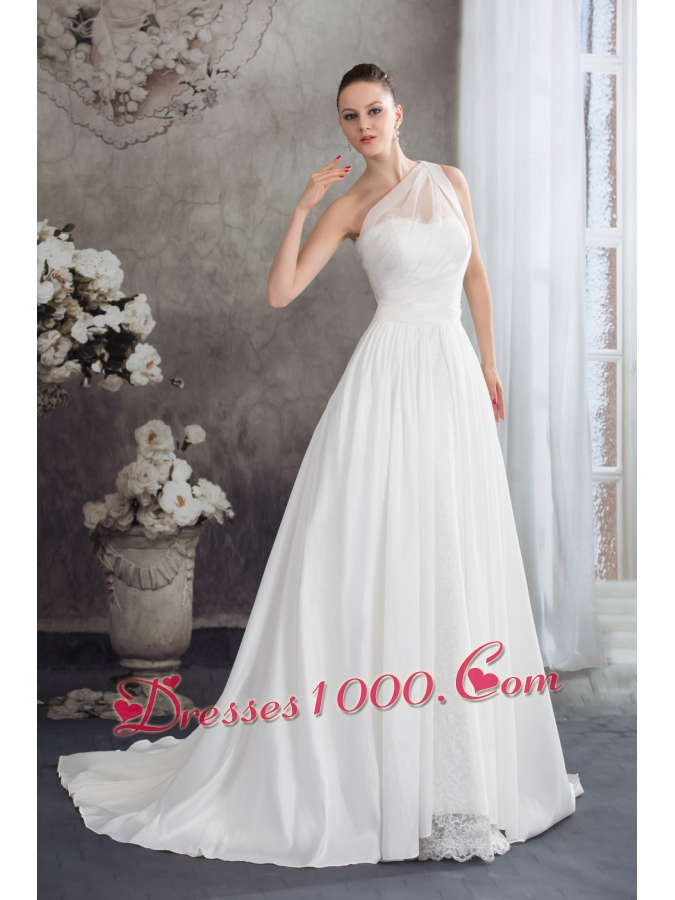 A-line One Shoulder Ruching Lace Court Train Wedding Dress