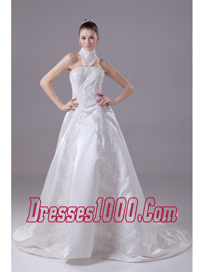 Appliques High Neck Taffeta Wedding Dress with Court Train