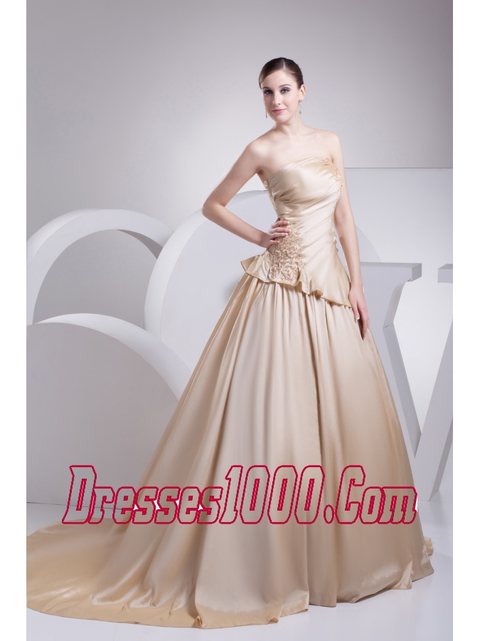 Appliques A-Line Strapless Chapel Train Wedding Dress with Champagne
