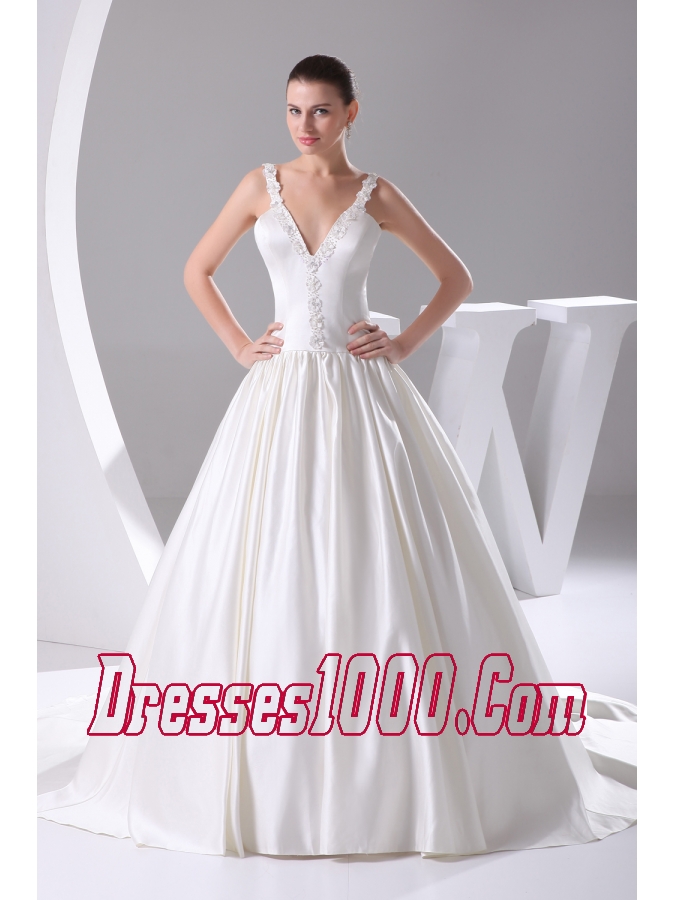 Romantic A-Line Straps Court Train Satin Beading Wedding Dress