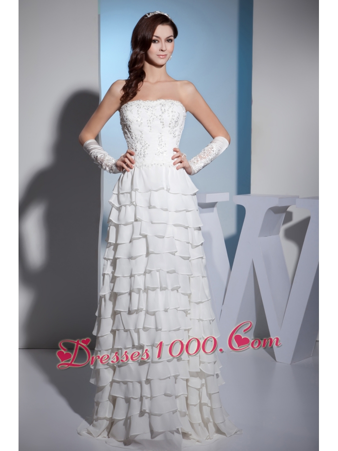 Embroidery Ruffles Layers Strapless Column Floor-length Wedding Dress