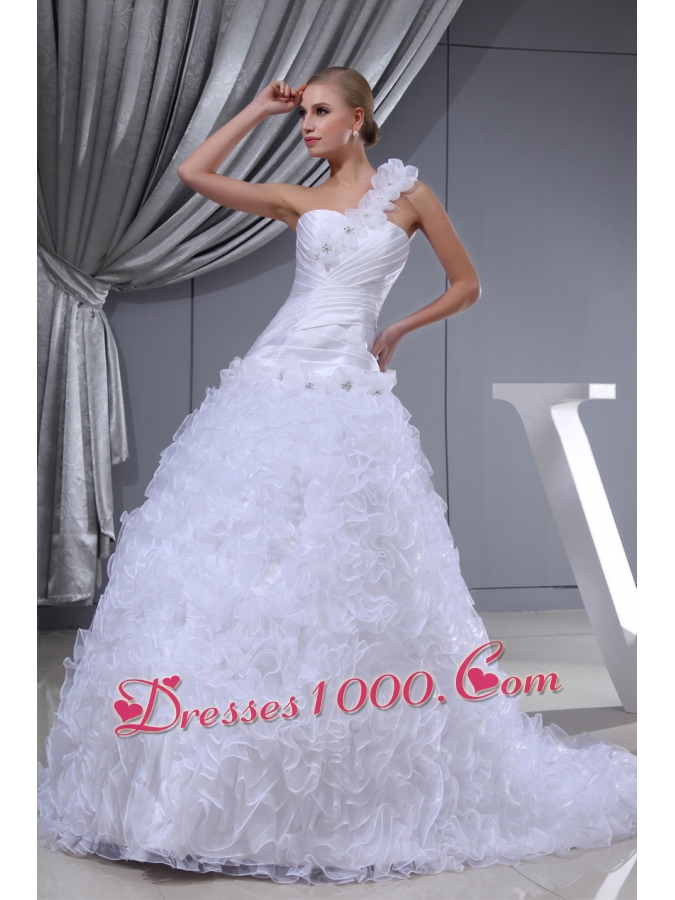 Ruffles Hand Made Flowers A-line One Shoulder Beading Wedding Dress