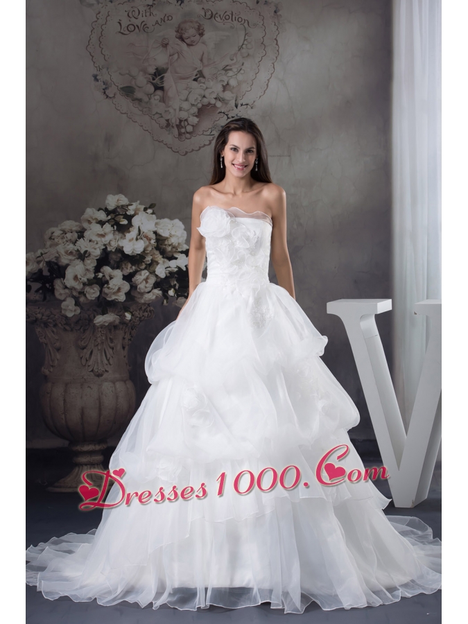 White A-line Hand Made Flowers Court Train Wedding Dress