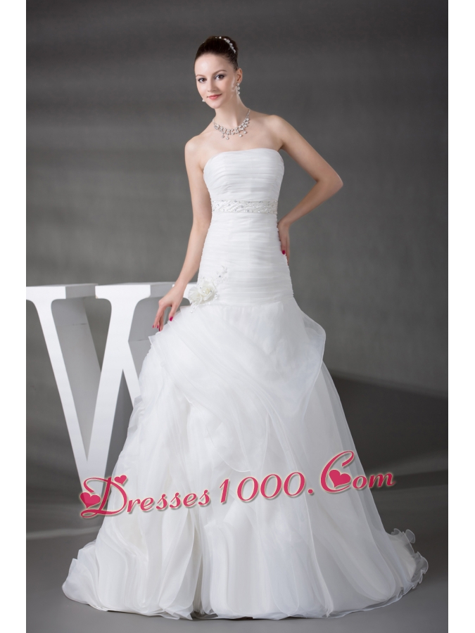 A-line Pick-ups Ruching Appliques Strapless Wedding Dress