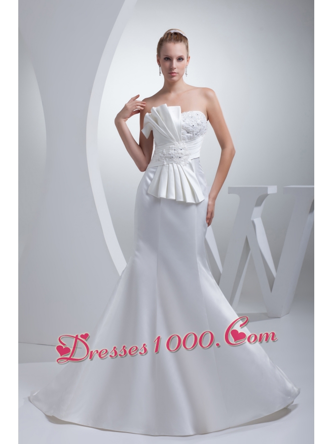 Strapless Satin Mermaid Ruching Appliques Wedding Dress