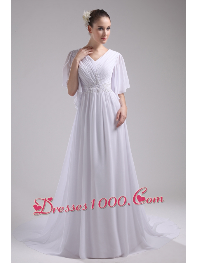 Empire V-neck Ruching Half Sleeves Cheap Wedding Dress