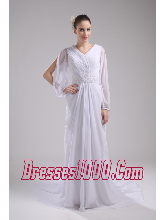 Column V-neck Ruching Long Sleeves Wedding Dress