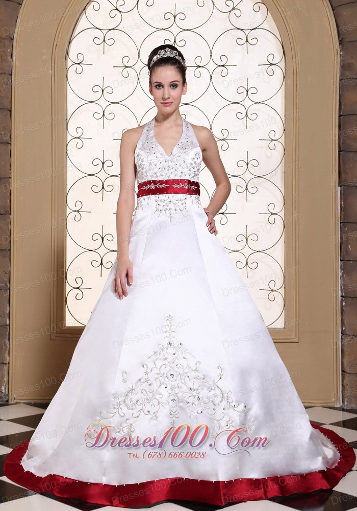 You will be a real surprise in this elegant wedding dress for your husband and other people! The embroidery torso dotted with shimmering beading features a halter top forming a V-neckline which beautify the dress. To catch your eye, the red waistband adds some embellishment on the mid-section. The A-line skirt is embellished with floral embroidery and beading and has a red hem which makes you a princess. The lace up open back and embroidery in the red satin lined clap handle streaming to the hem finish the overall look.