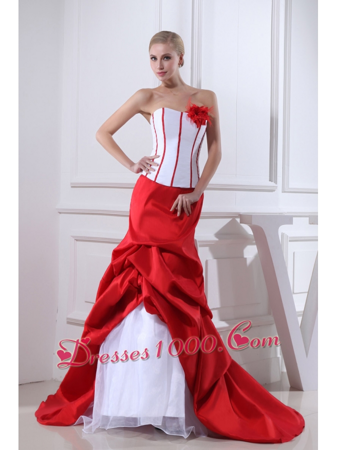 Pick-ups Mermaid Strapless Hand Made Flower Court Train Red Wedding Dress
