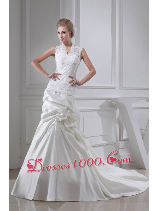 Lace Pick-ups V-neck Mermaid Chapel Train Wedding Dress