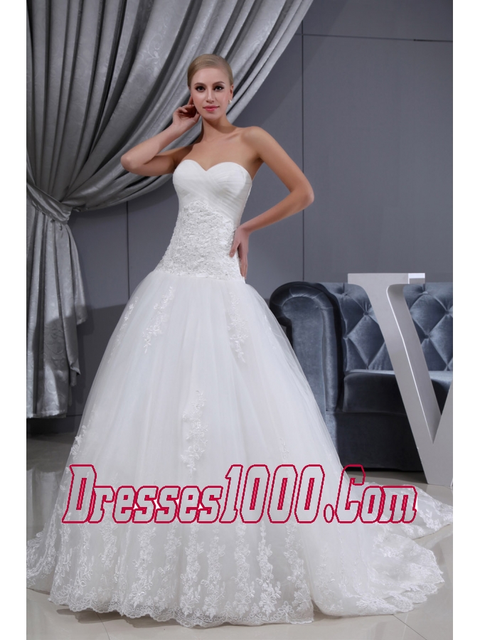 Lace Ruching Sweetheart A-line Chapel Train Wedding Dress