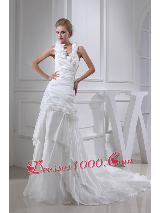 Hand Made Flowers Column Halter Chapel Train Wedding Dress