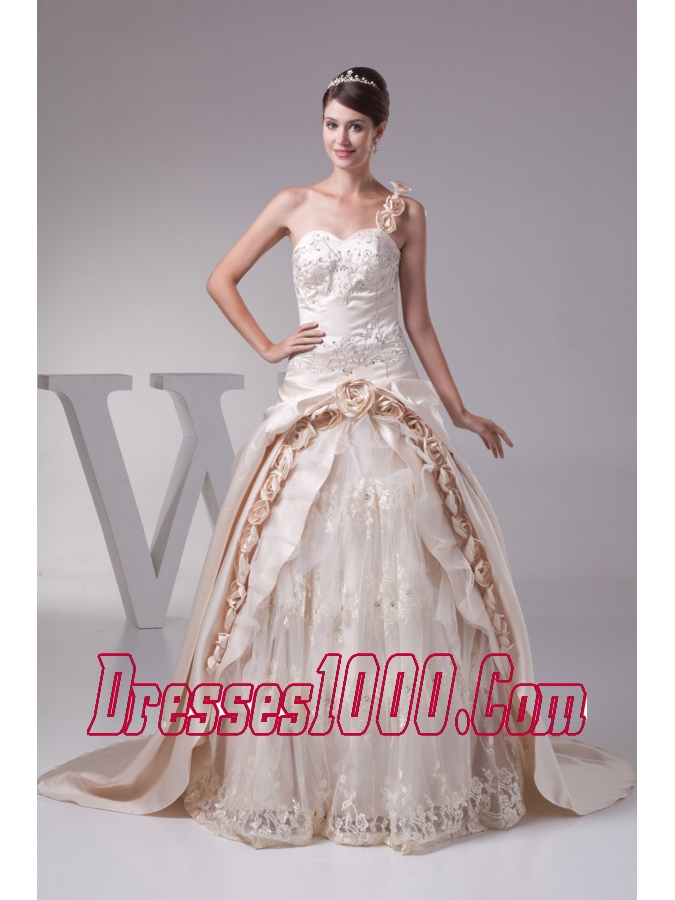 Champagne One Shoulder Hand Made Flowers Embroidery Wedding Dress