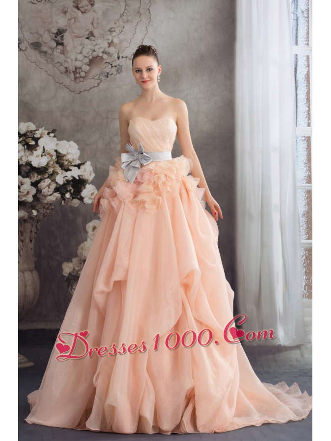 Baby Pink A-line Strapless Ruffles Sash Court Train Wedding Dress