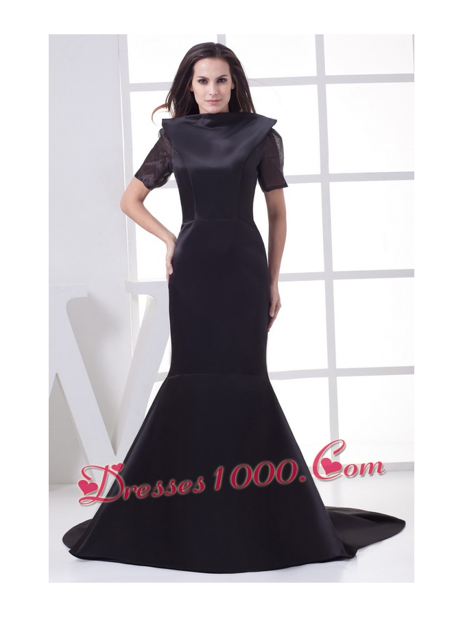 Black High-neck Short Sleeves Mermaid Chapel Train Mother of the Bride Dress