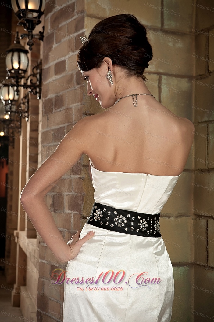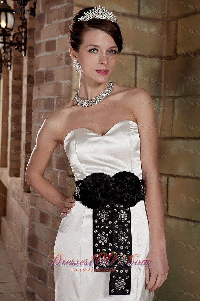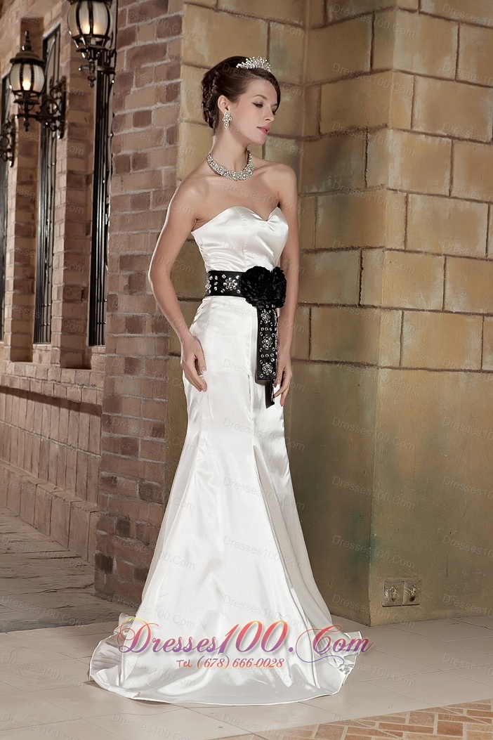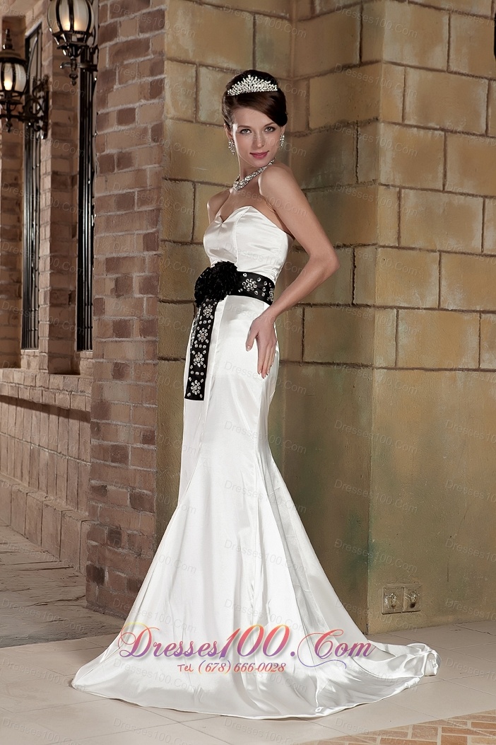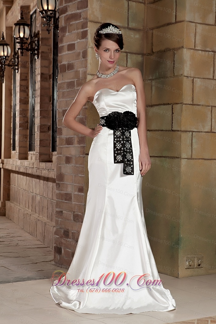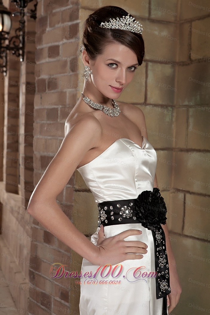 Sweetheart Brush Train Satin Beading Wedding Dress Black Sash