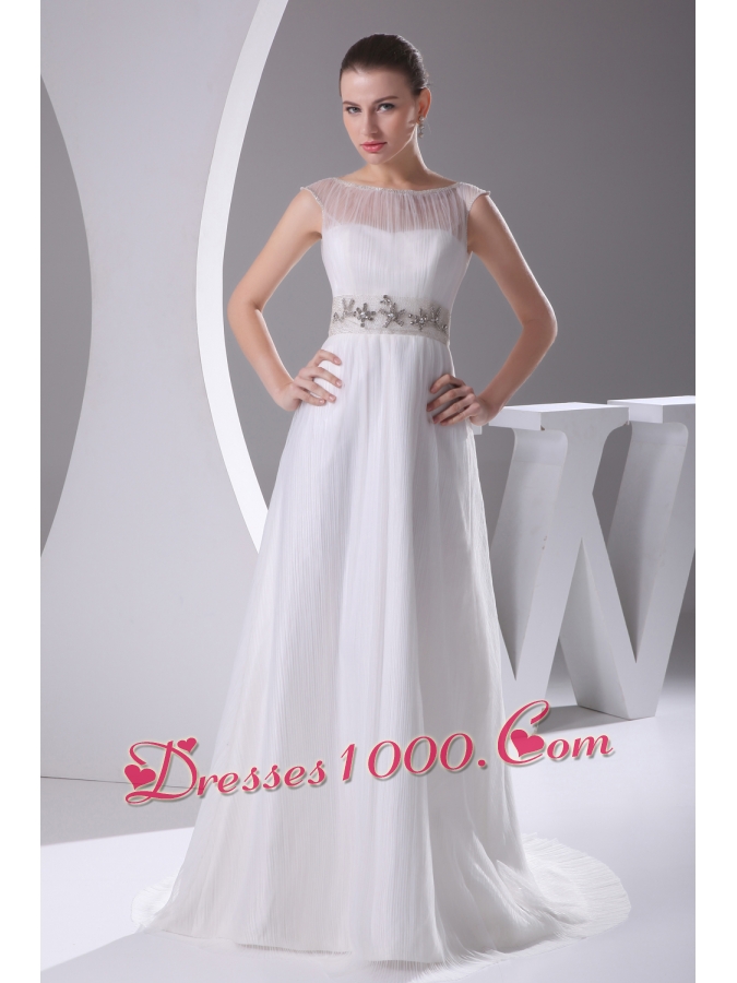 Bateau A-line Beading Brush Train Wedding Dress