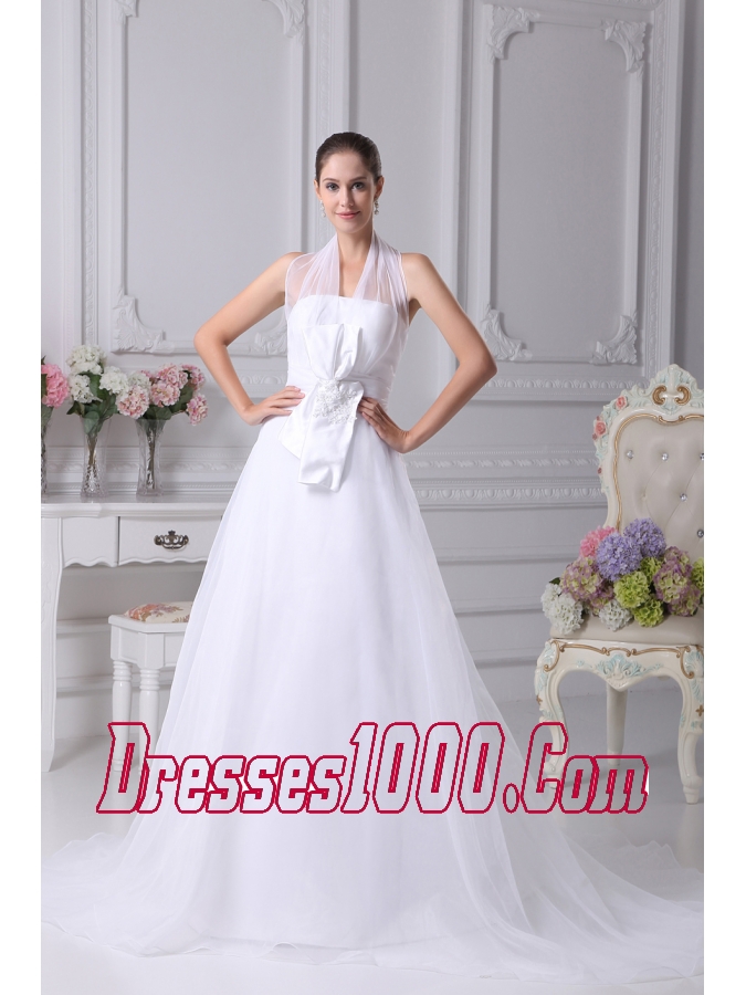 Beading Court Train Halter A-Line Wedding Dress with Fitted Waist