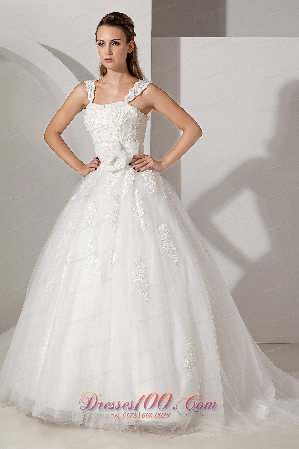 You`re sure to be on cloud nine when you check yourself out in this fanciful and fabulous creation! The strapless bodice supported by broad laced straps. The fitted torso stands out for bulky lace embroidery and the dropped waist is highlighted by a chic flower.The flared, floor-length skirt made of soft and flowy tulle is worked to produce eye-catching impression.Dramatically tiered layers whirl and swirl every which way on the elaborately appointed skirt.