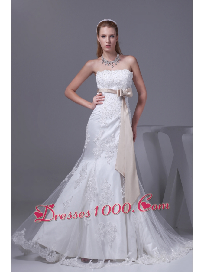 Lace Sash Strapless Mermaid Court Train Wedding Dress