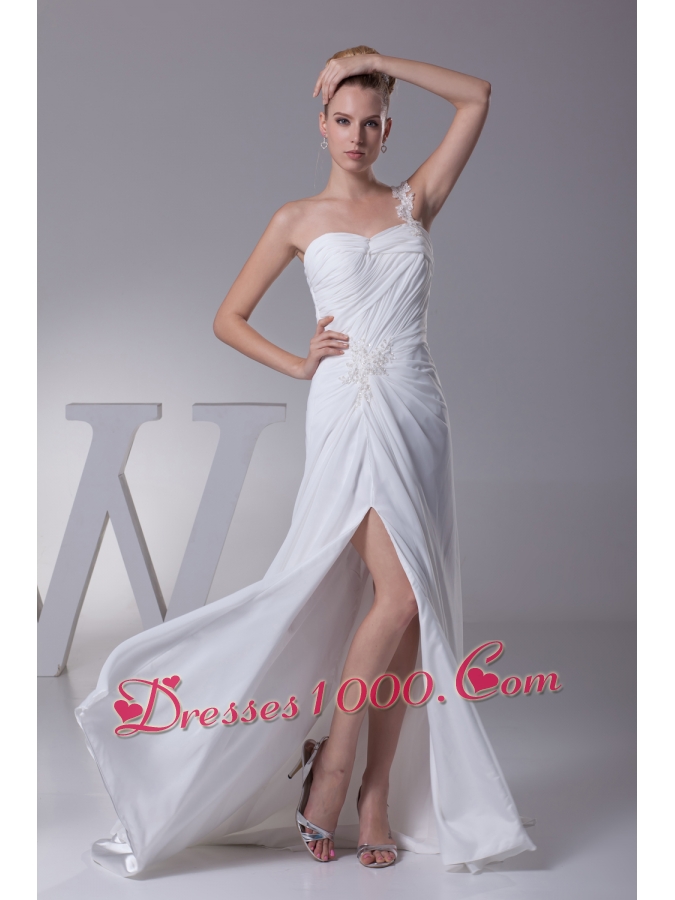 One Shoulder High Slit Ruching Appliques Wedding Dress