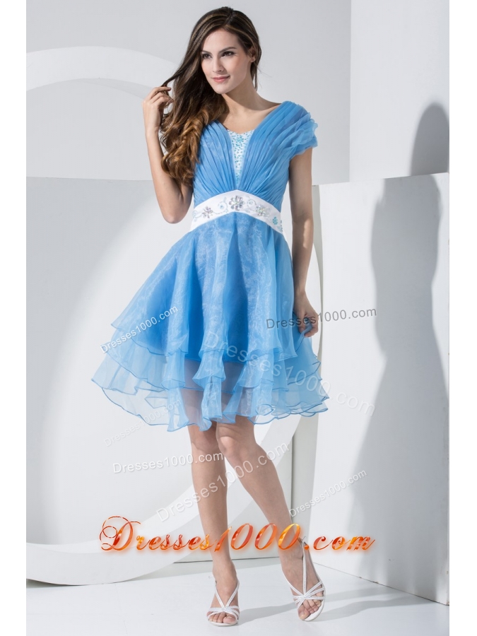 Beadings and Sash Decorated Short Sleeves U-neck Tiers Prom Dress