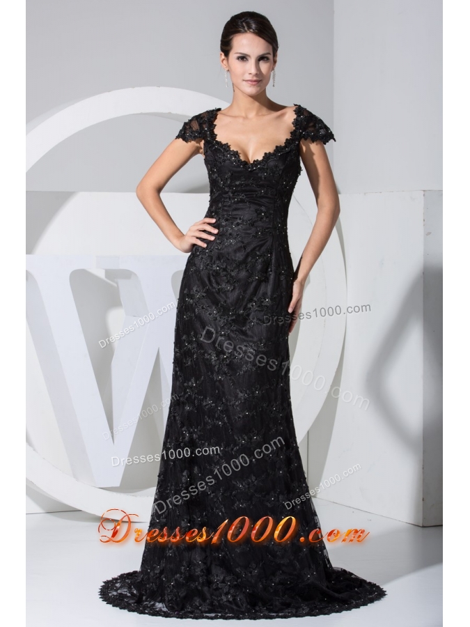 Black Lace Flowers Cap Sleeves Scoop Prom Dresses with Sweep Train