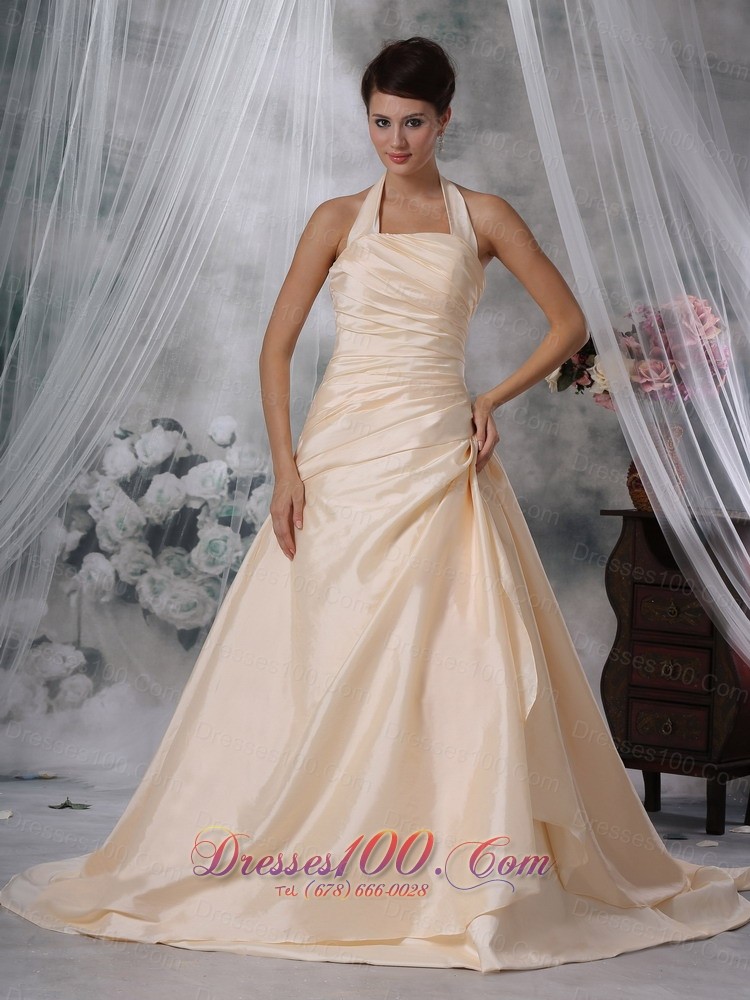 Halter Ruched Champagne Colored Wedding Dress Taffeta