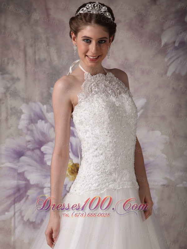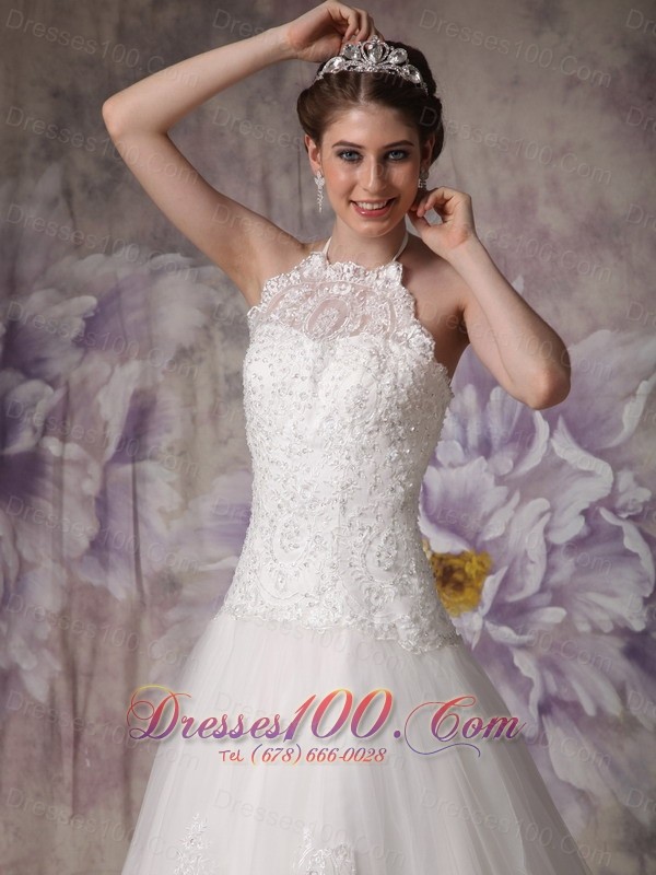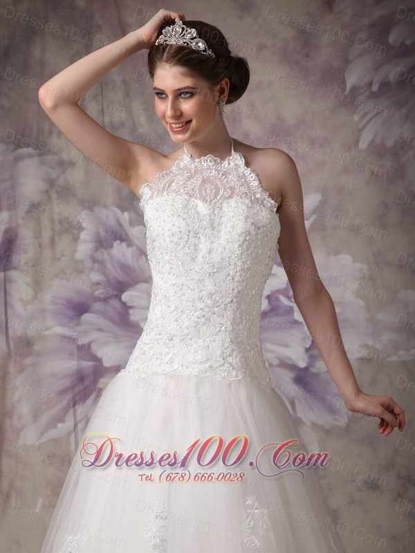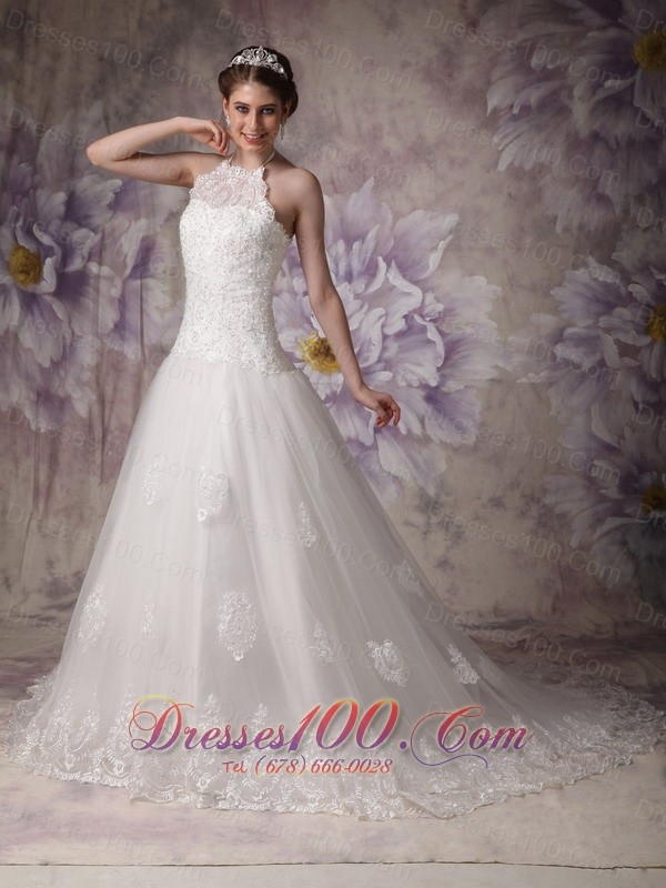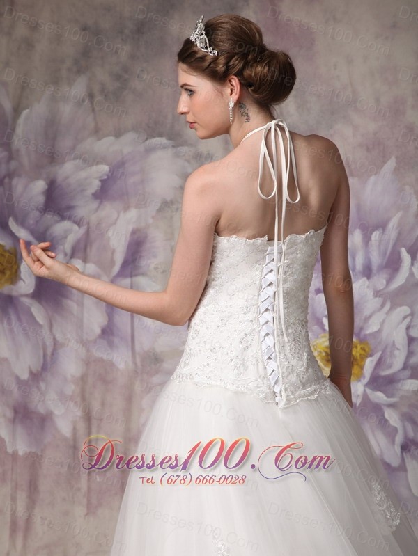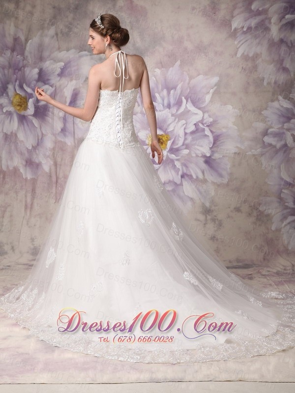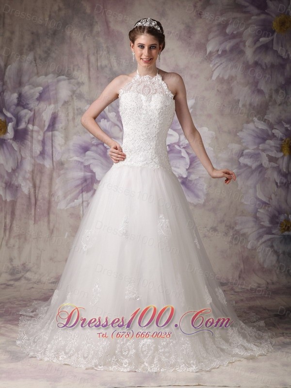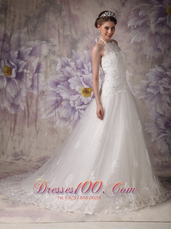 Halter Chapel Train Beading Lace Bridal Wedding Dress