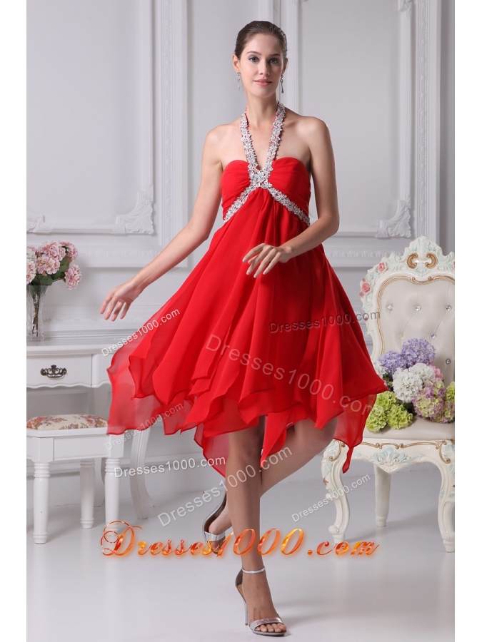 Sassy and stunning are the two words coming in your mind when you see this red prom dress at your first sight. The dainty bodice adorned with two beaded straps and halter top neckline. The irregular falbala stylish chiffon skirt is soft and elegant that flows freely to flatter most figures. A zipper up in the back completes this glamorous design.