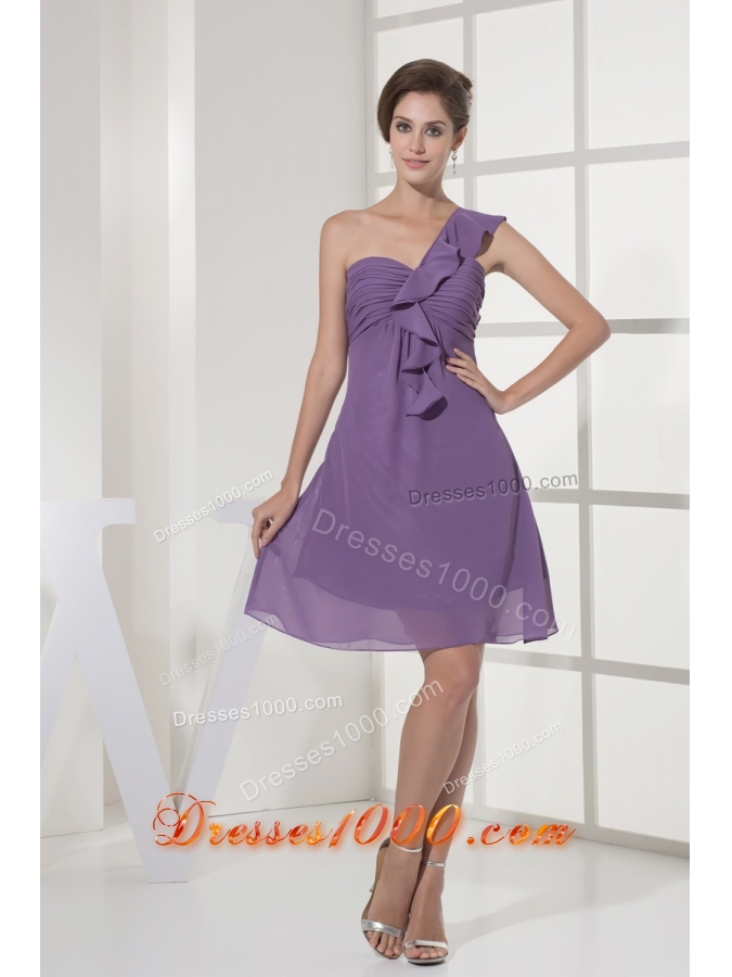 This short prom dress features one shoulder neckline with ruched bust area and falbala decoration along the shoulder . A-line silhouette. Made of chiffon and silk-like satin material in bright lavender. Back zipper closure.