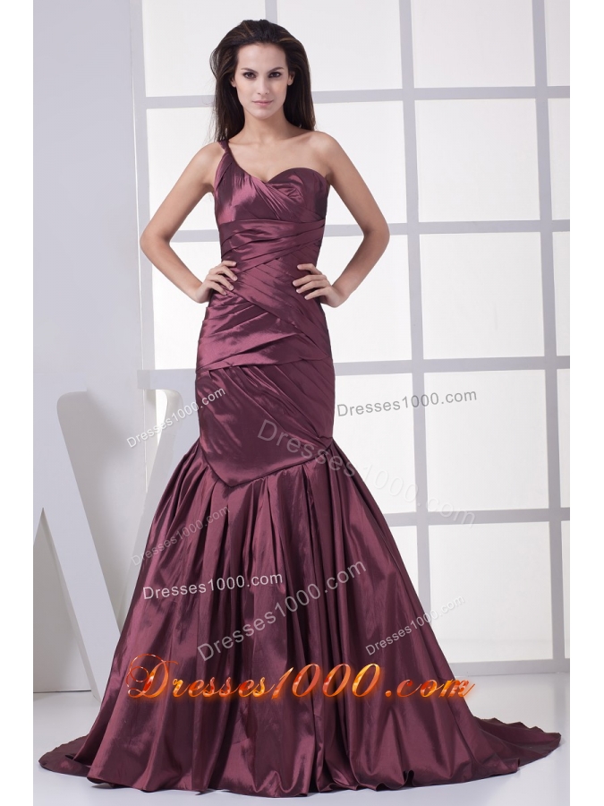 Burgundy One Shoulder Mermaid Ruched Brush Train Prom Graduation Dress