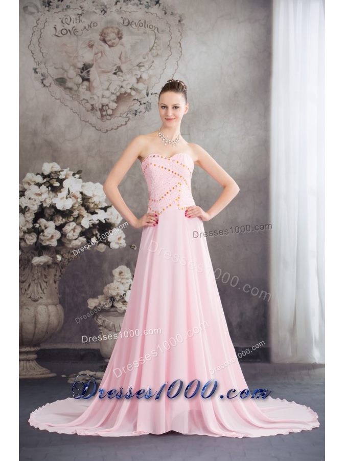 Sweetheart Court Train Pink Chiffon Prom Celebrity Dress with Beading